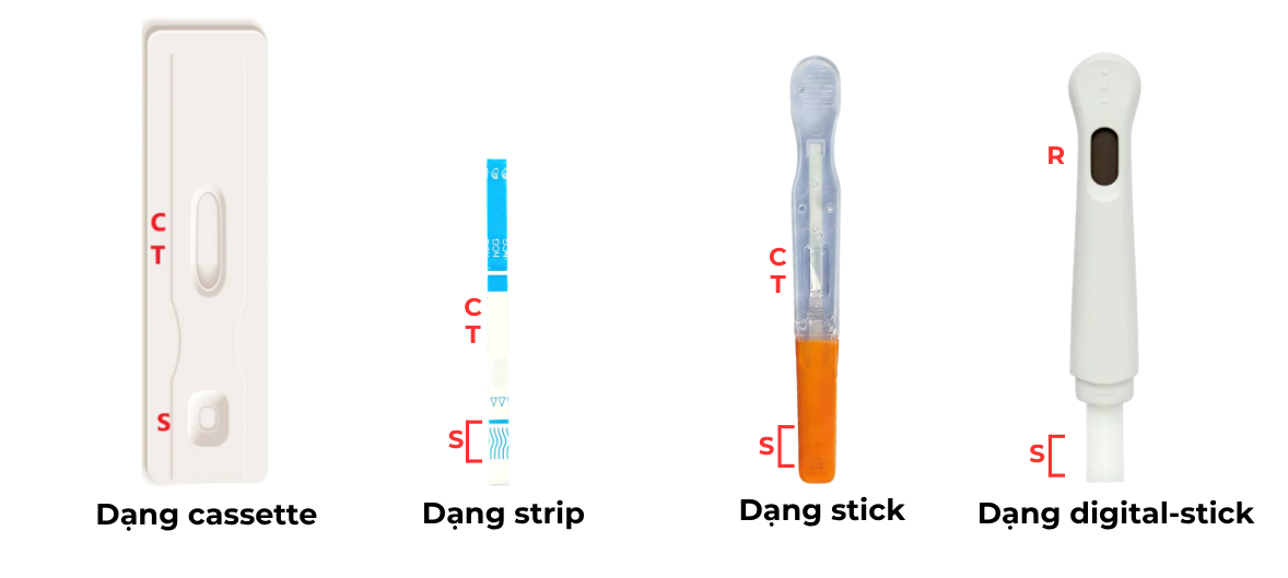Figure 4: Các dạng que thử thai phổ biến. C - vị trí hiển thị vạch kiểm soát; T - vị trí hiển thị vạch kết quả; S - vị trí nhỏ nước tiểu; R - vị trí hiển thị kết quả điện tử của que thử.